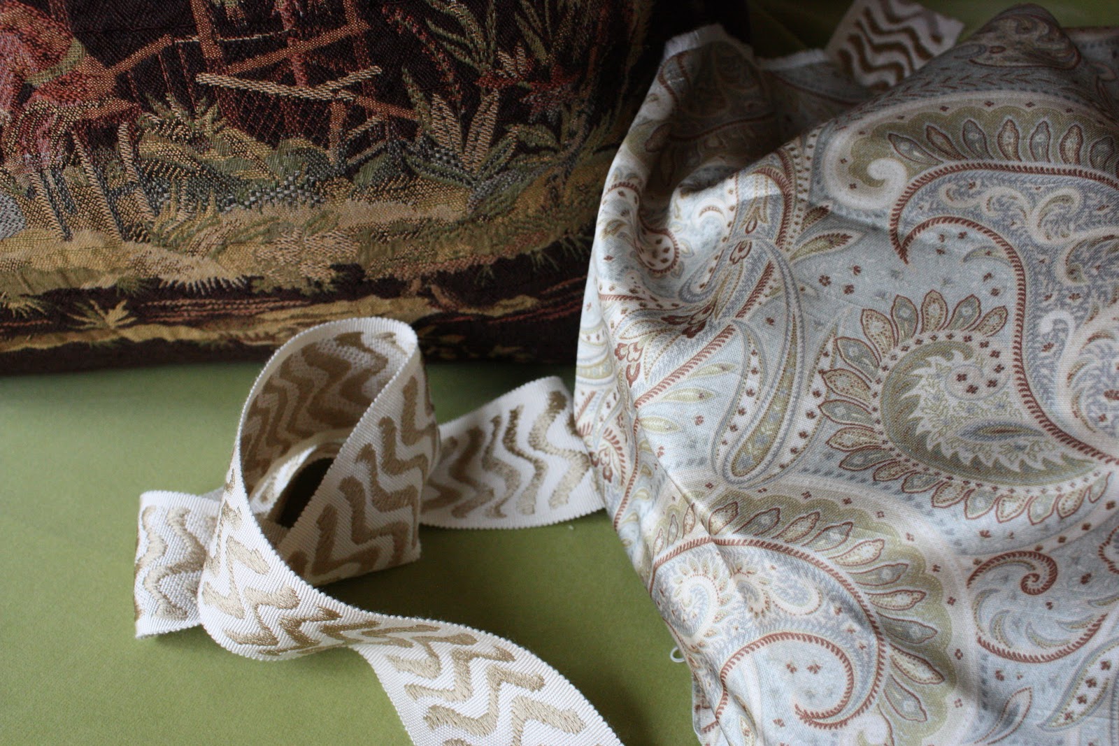 In reality, the wall is darker than it appears here, and the Versailles pattern wallpaper by Jaima Brown has the exact BM Crown Point Sand color in it as the walls are painted. The stained woodwork is reflected in the warm brown tones in the paper, too.